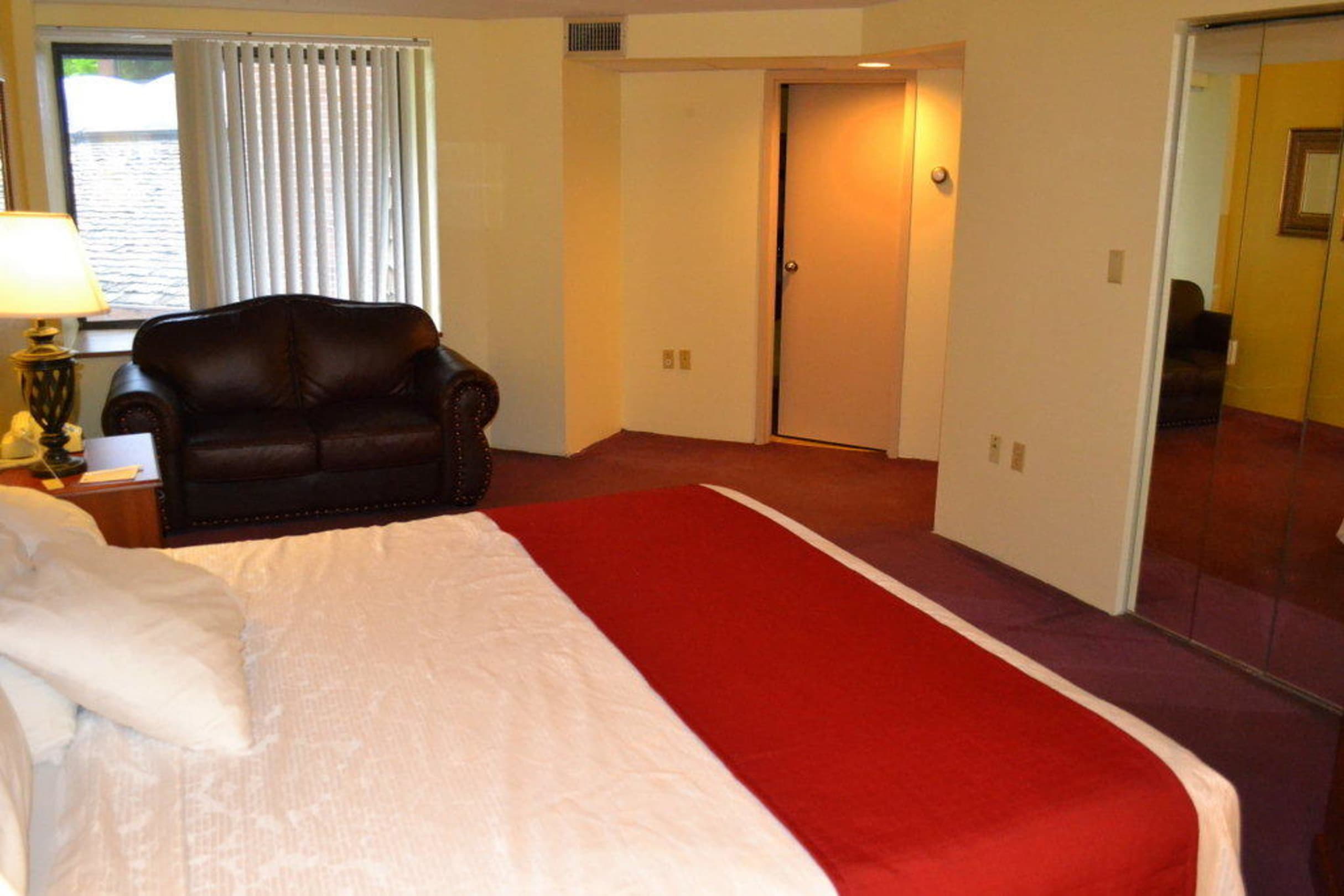 Blick über das Kingsize Bed der Whirlpool-Suite zum Eingangsbereich
