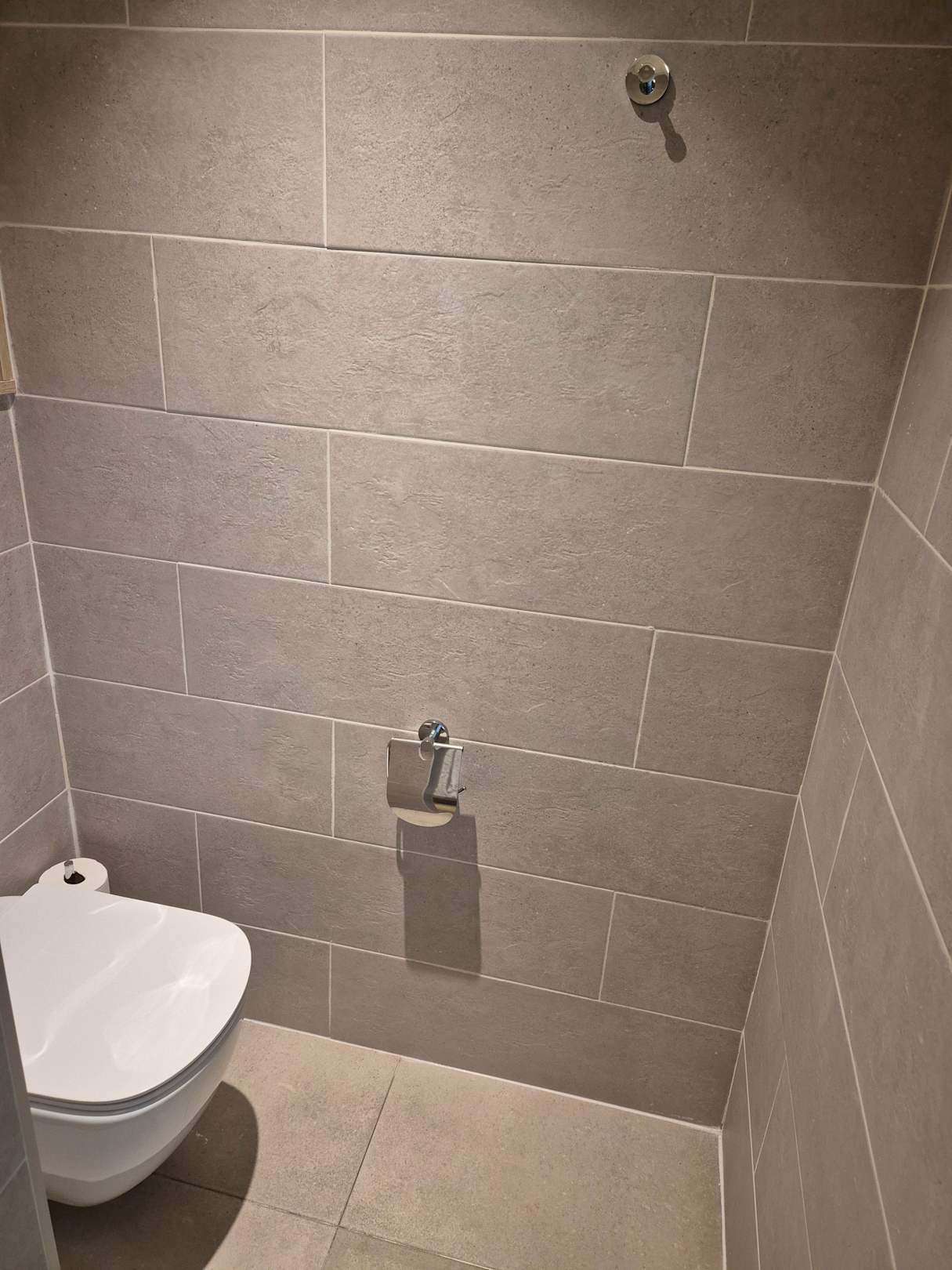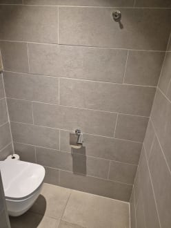 WC abgetrennt vom Duschbereich durch Milchglastür mit Schiebefunktion
