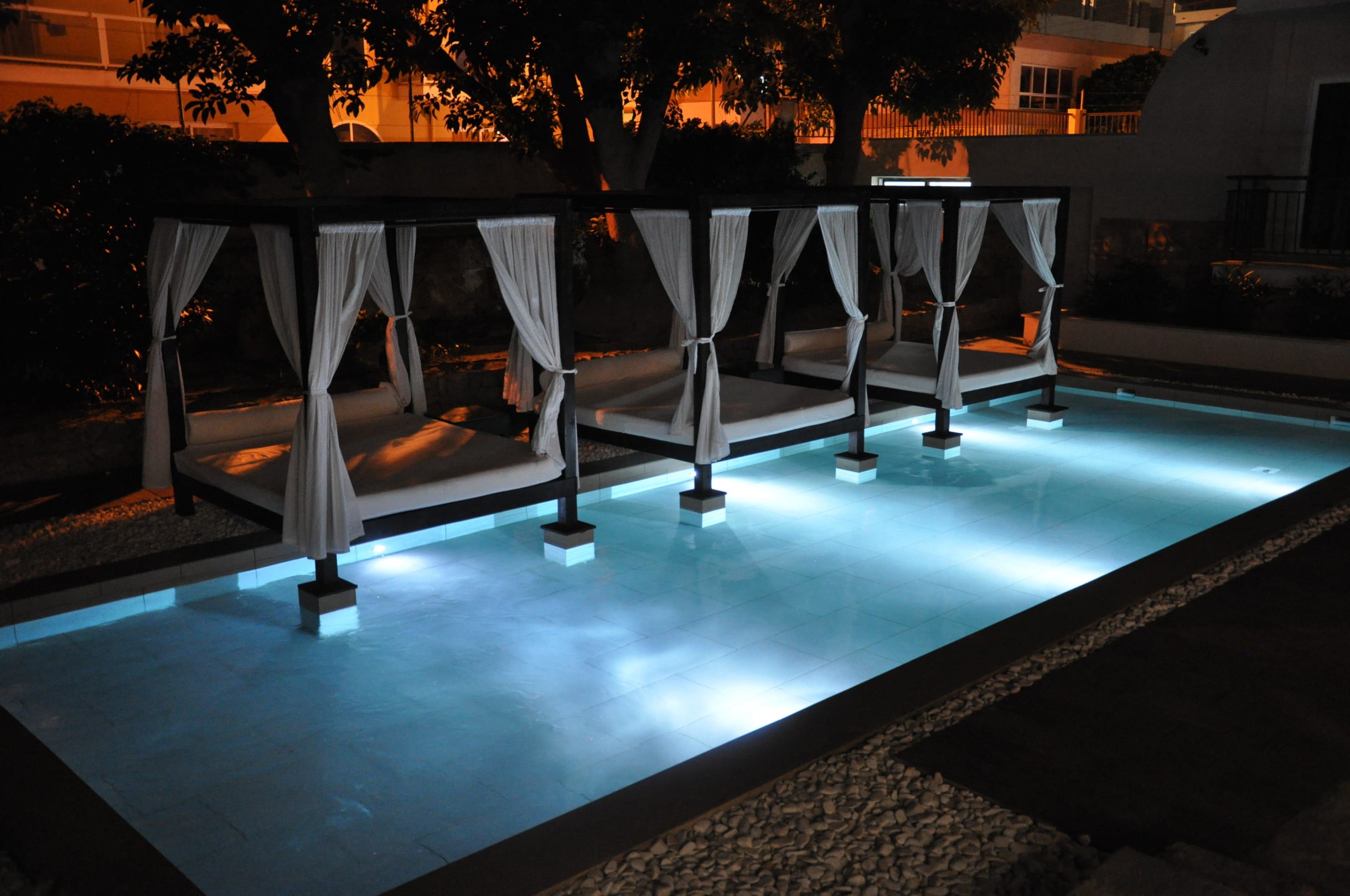 Himmelbetten an kleinem Pool
