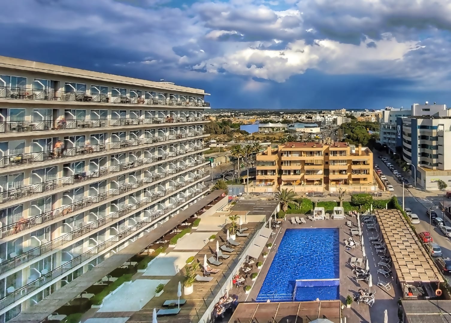 Blick vom westlichen Hotelflügel auf die Pooolanlage.