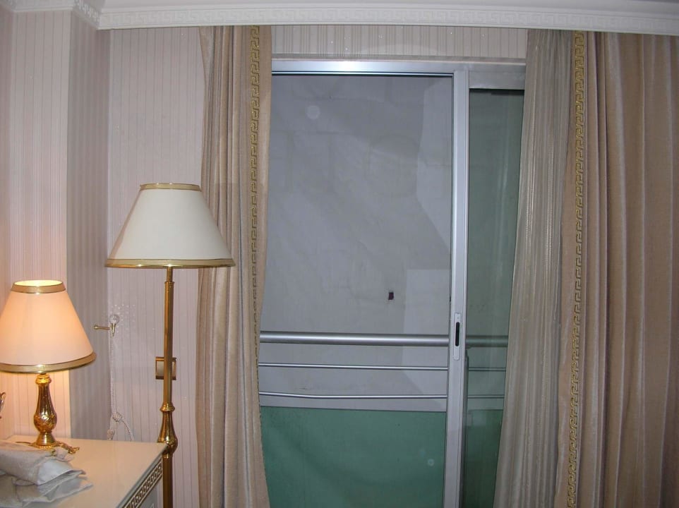Unser Zimmer. Vor dem Balkon hing eine Bauplane, wir konnten nicht nach draußen sehen. Ein verzweifelter Gast hatte bereits ein Guckloch in die Bauplane gebohrt.