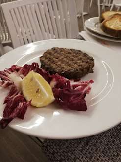 Hamburger mit einem Zitronenstückchen und zwei Blättchen Salat