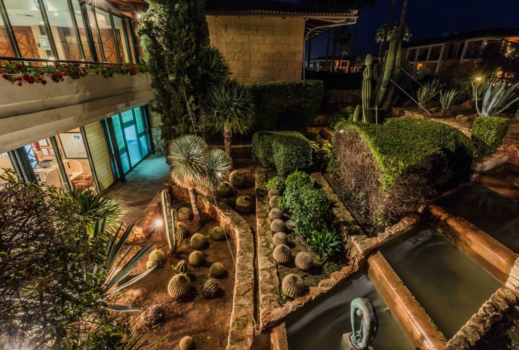 Gepflegter Kakteengarten am Hauptgebäude am Abend.