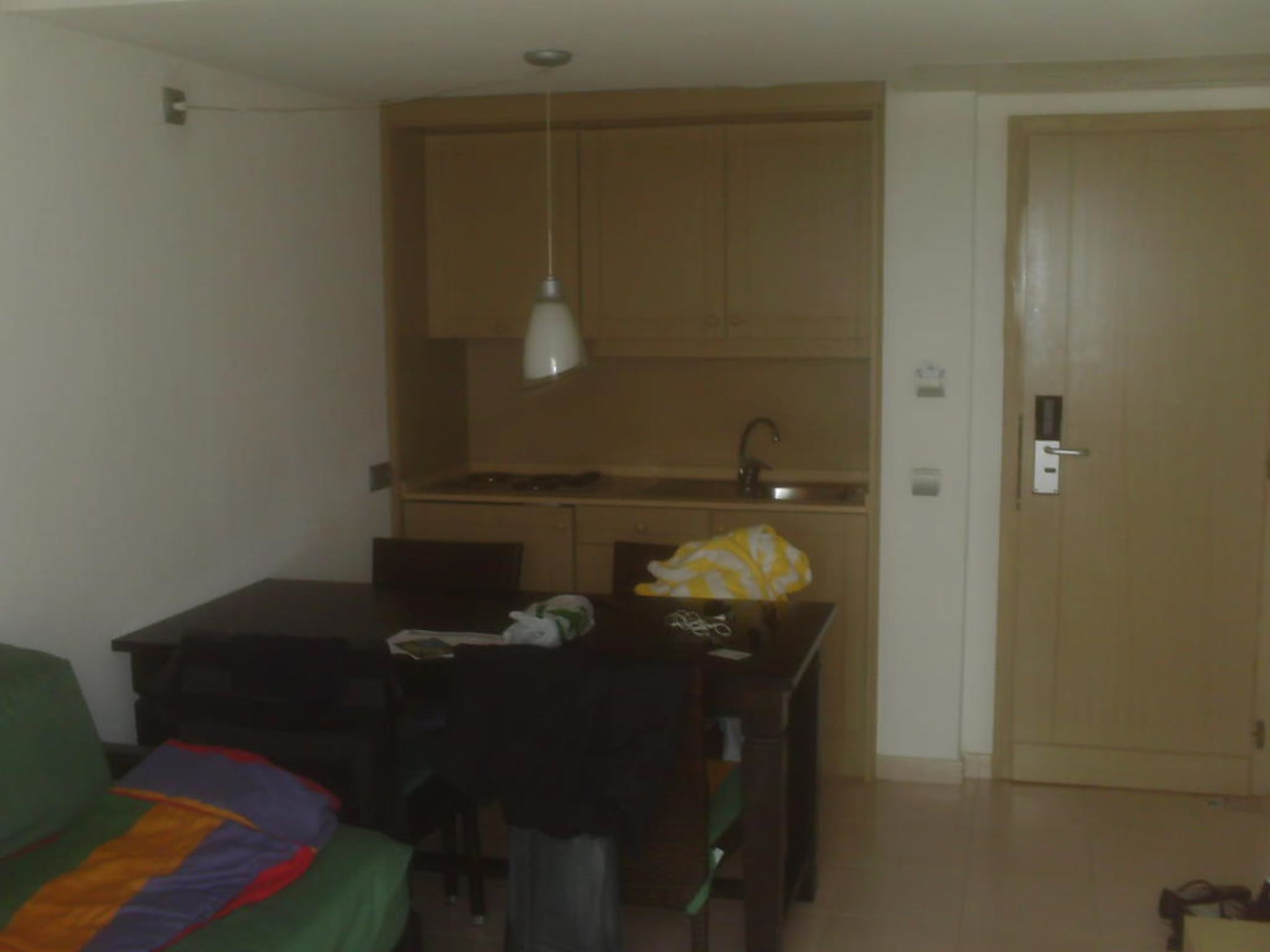 Links vorne das Sofa, dahinter die eingebaute Küche mit Sitzmöglichkeit.