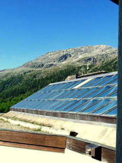 Ausblick vom Zimmer mit Hallenbad im Vordergrund