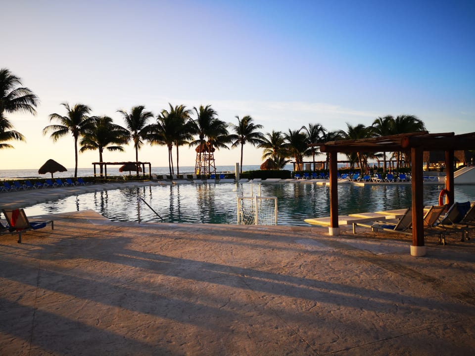 Beach is in behind the pools. Pools are flanked by 2 bars (1 attached to a restaurant)