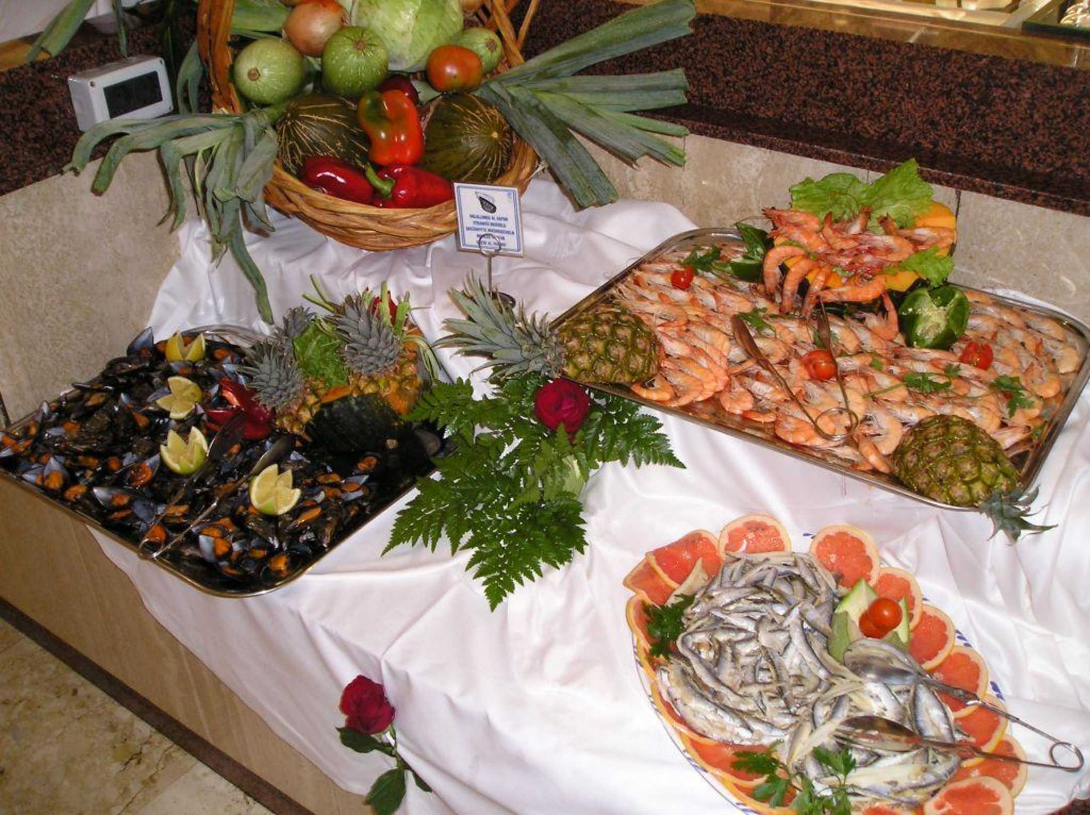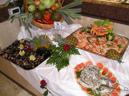 Ansicht GalabuffetEinmal in der Woche gibt es ein "Galabuffet". Hier ein Bild der Platte mit Shrips, Muscheln und kleinen Fischen.