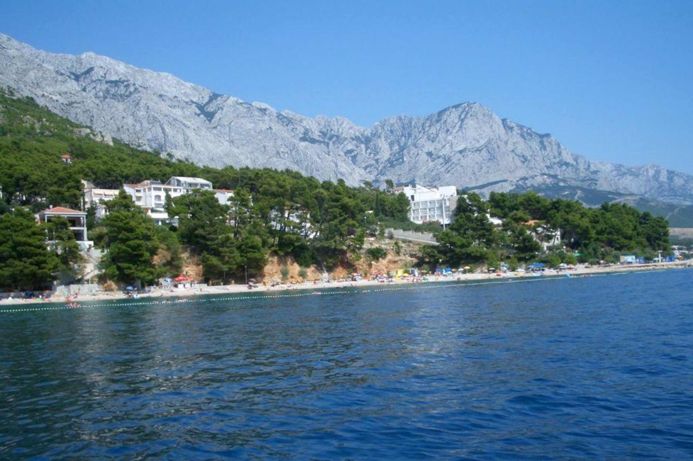 Teil des Hotel Strandes vom Boot aus aufgenommenHotel ist rechts "oben" im Hintergrund von der Seite gesehen