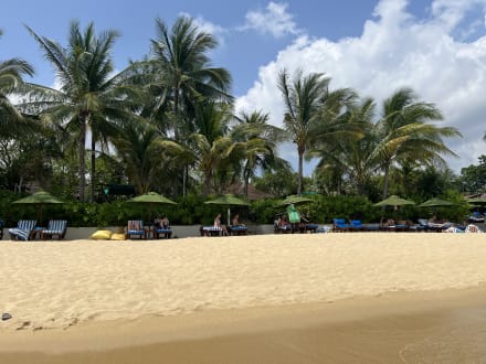 Der Stand mit den Liegen und Schirmen vom Hotel