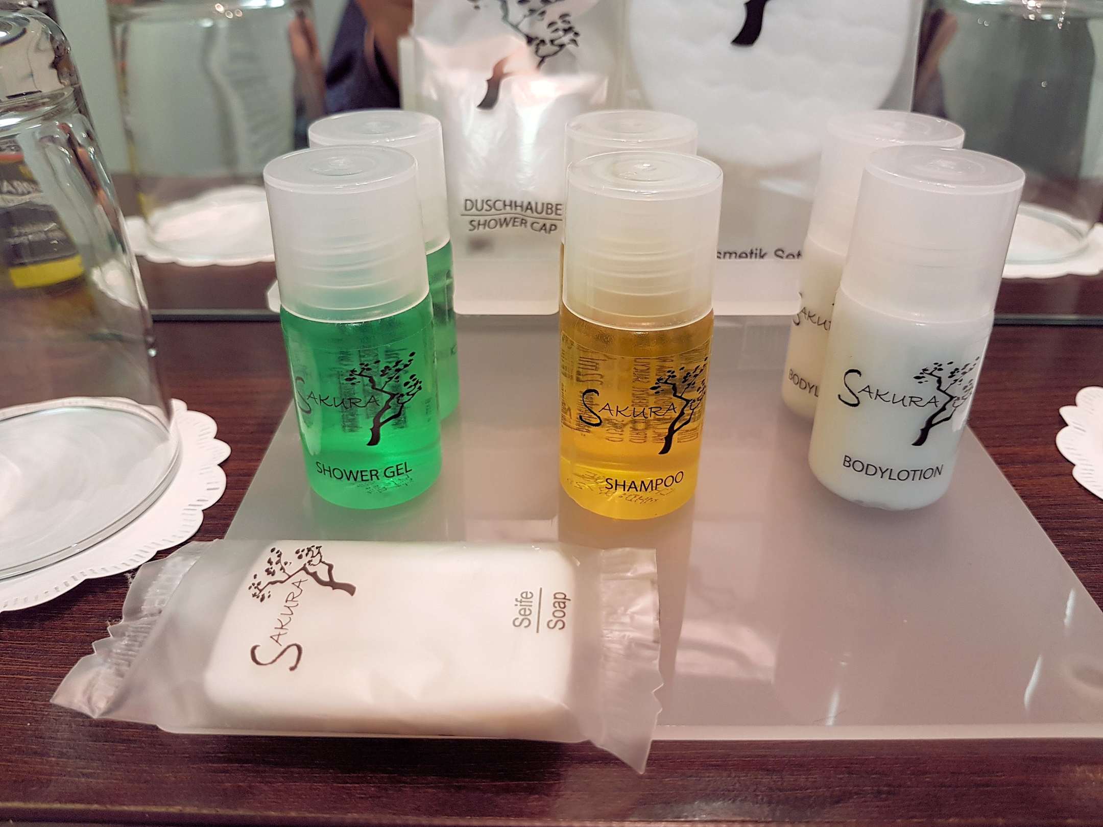 Wird jeden Tag aufgefüllt, Duschgel, Shampoo und Bodylotion sowie Seife