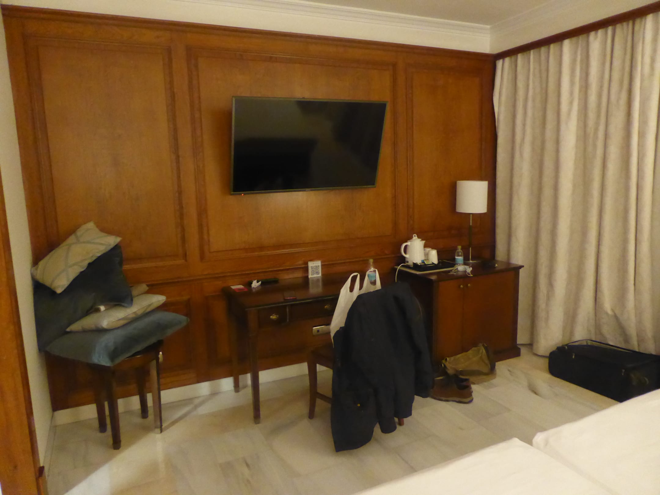 Blick von der Bettseite aus in das Zimmer. Links befindet sich das Bad und der Eingangsbereich.