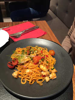 Chillispaghetti mit Gemüsewürfel und Garnelen