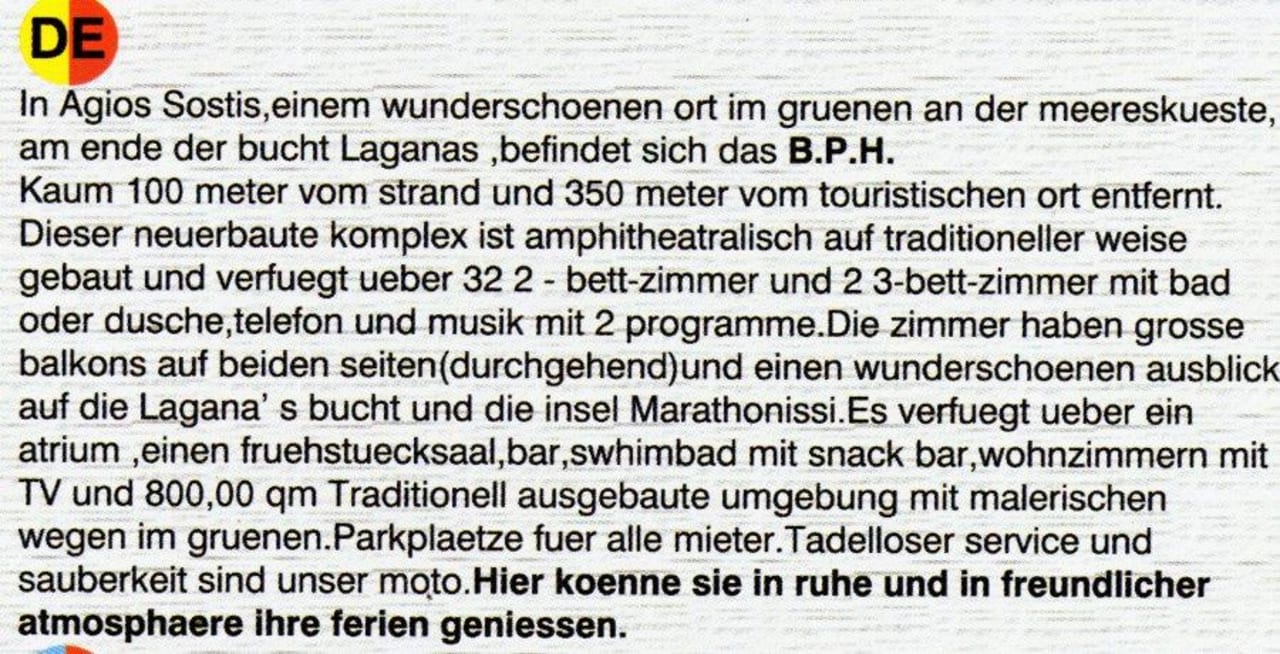 Der deutschsprachige Text aus dem Prospekt des Bozikis Palace.
