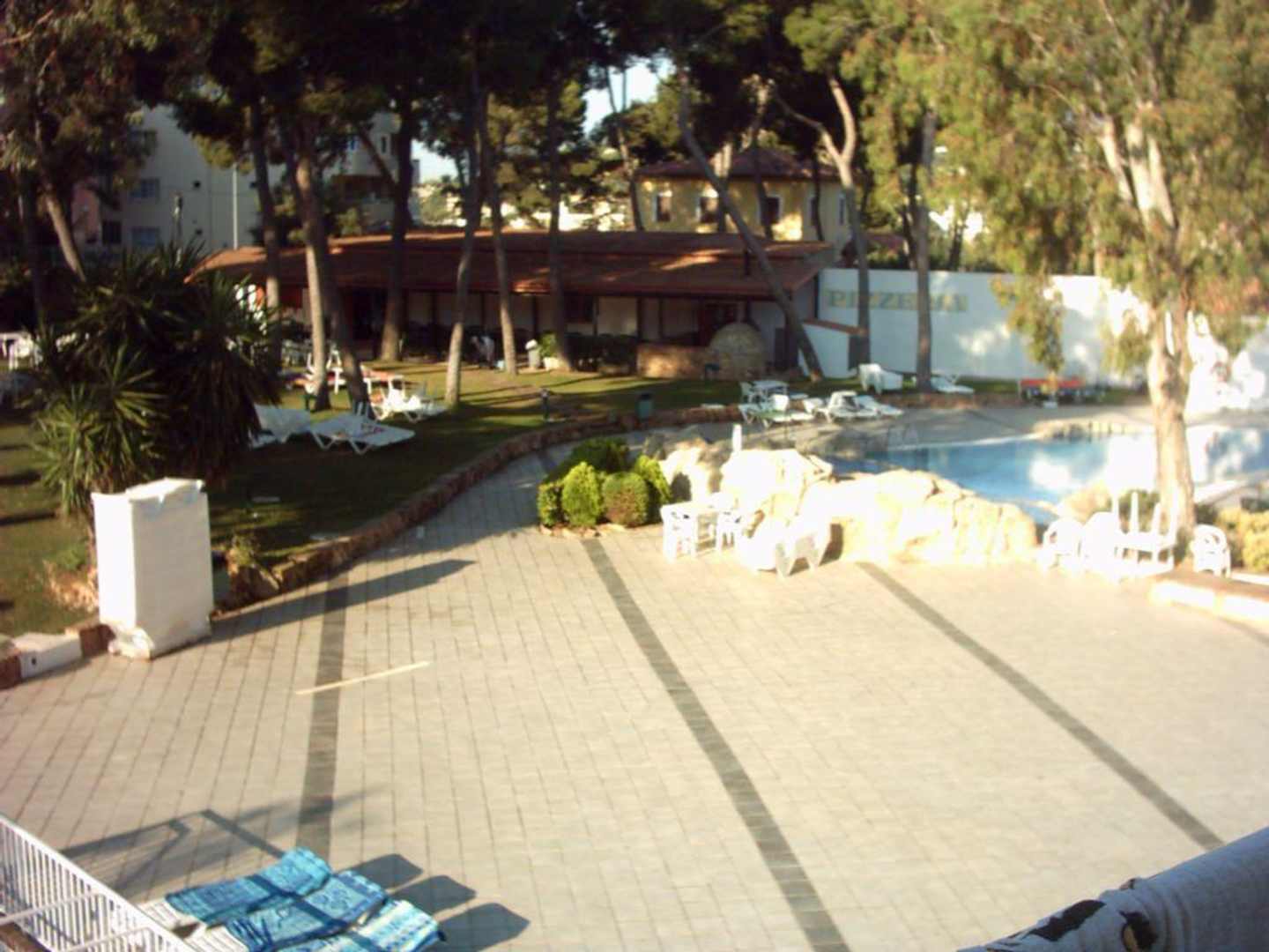 Blick auf ein Stück von der Aussenanlage mit der Pizzabar im Hintergrund.