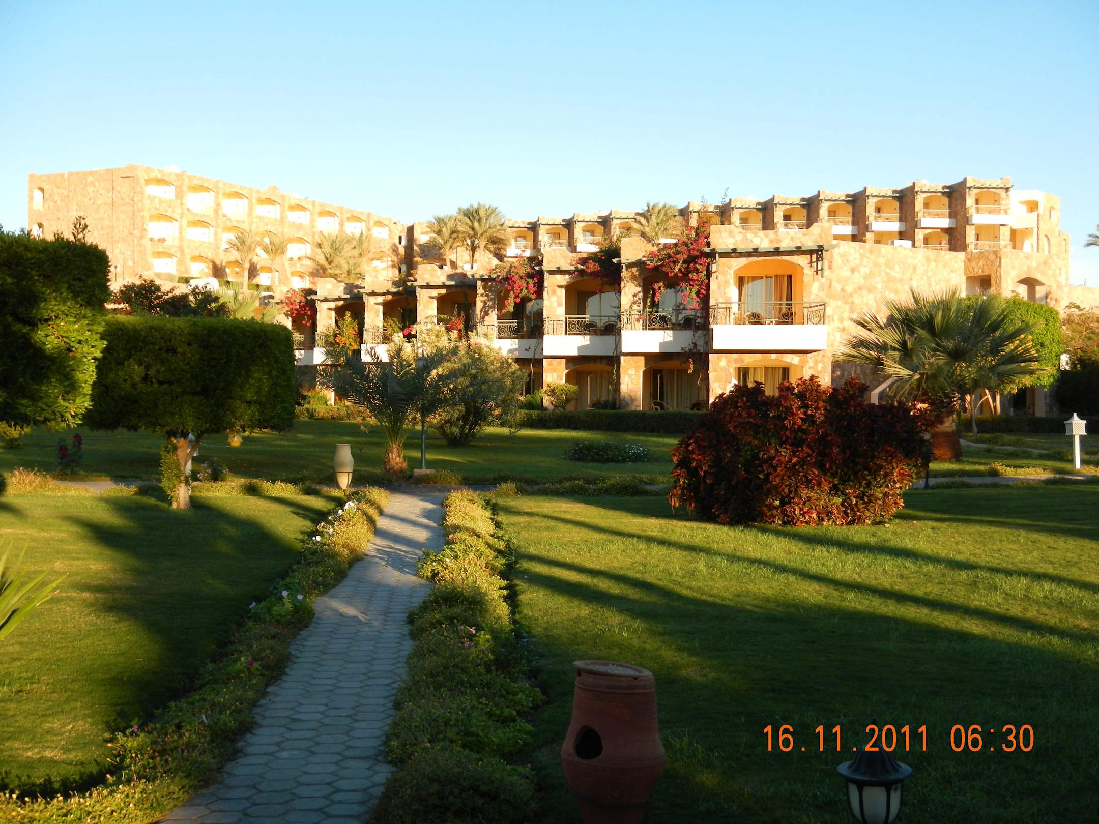 2 stöckige Bungalows und hinten 4 stöckiges Hotelgebäude