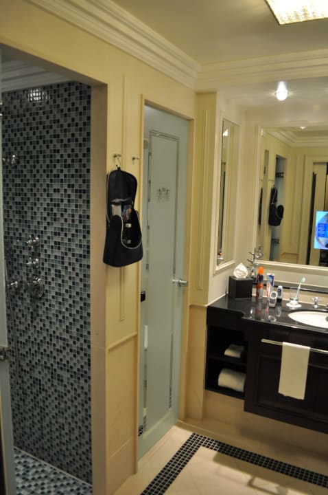 Im Bad sind Badewanne,WC RegenDusche vorhanden. Natürlich auch ein TV Gerät im Spiegel.