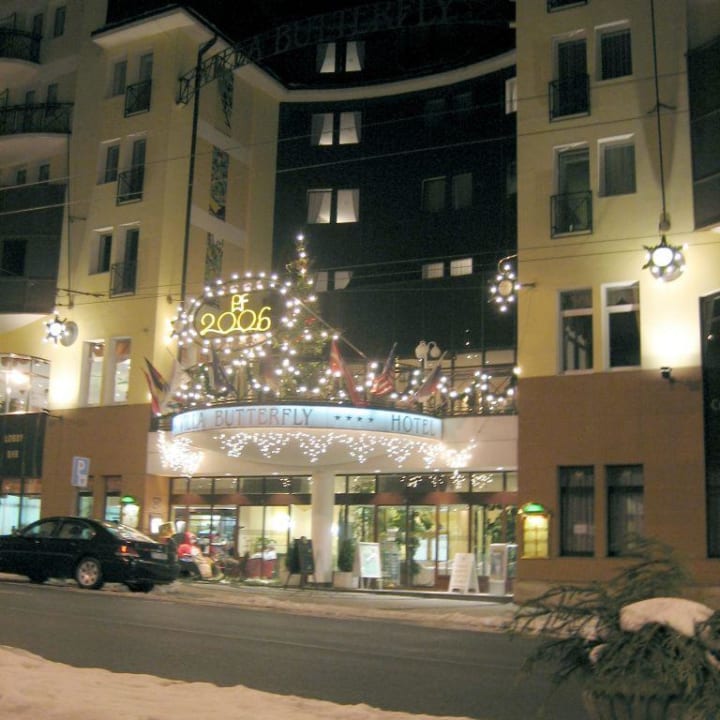 Hoteleingang zum Jahreswechsel in der Nacht