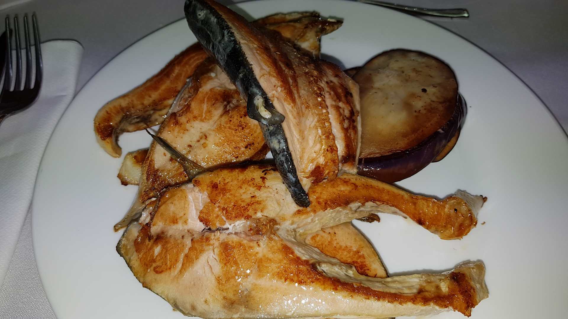 Abendessen: gebratener Fisch und Auberginen vom Live-Cooking.