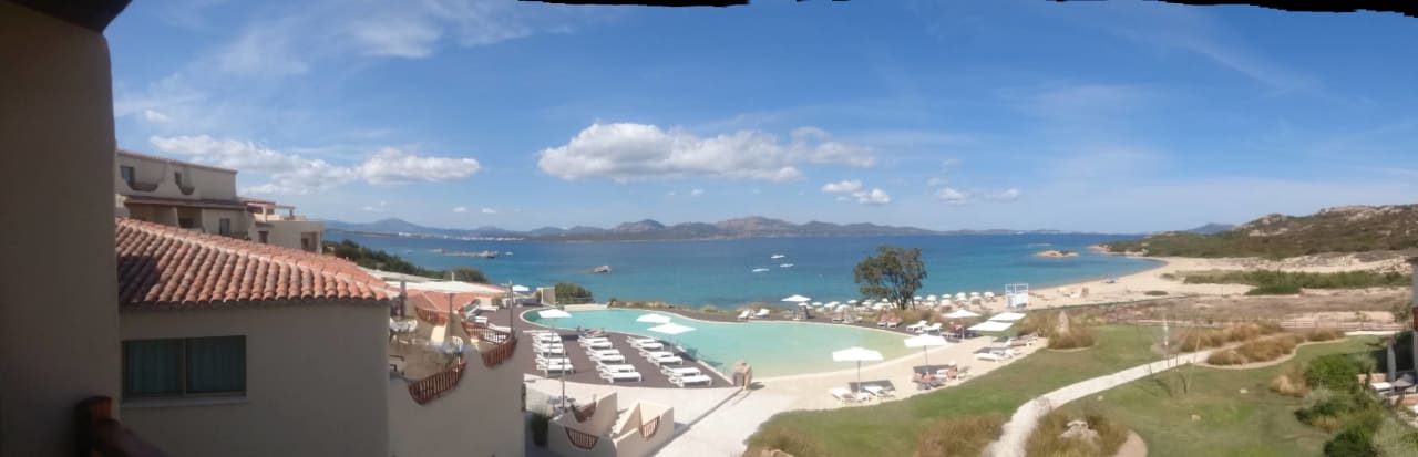 Blick vom Balkon der Junior-Suite auf den Pool und den Hotel-Strand