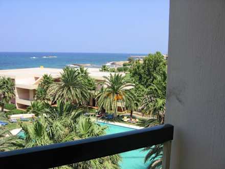 widok z balkonu na morze i basen
