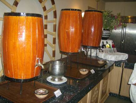 Leider auch hier, wie in anderen AI-Hotels: Der (billige) Wein wird in Fässer gekippt, aus denen sich Gast ein Gläschen zapfen kann. Besseren Wein in Flaschen gab es gegen Aufpreis. :-(