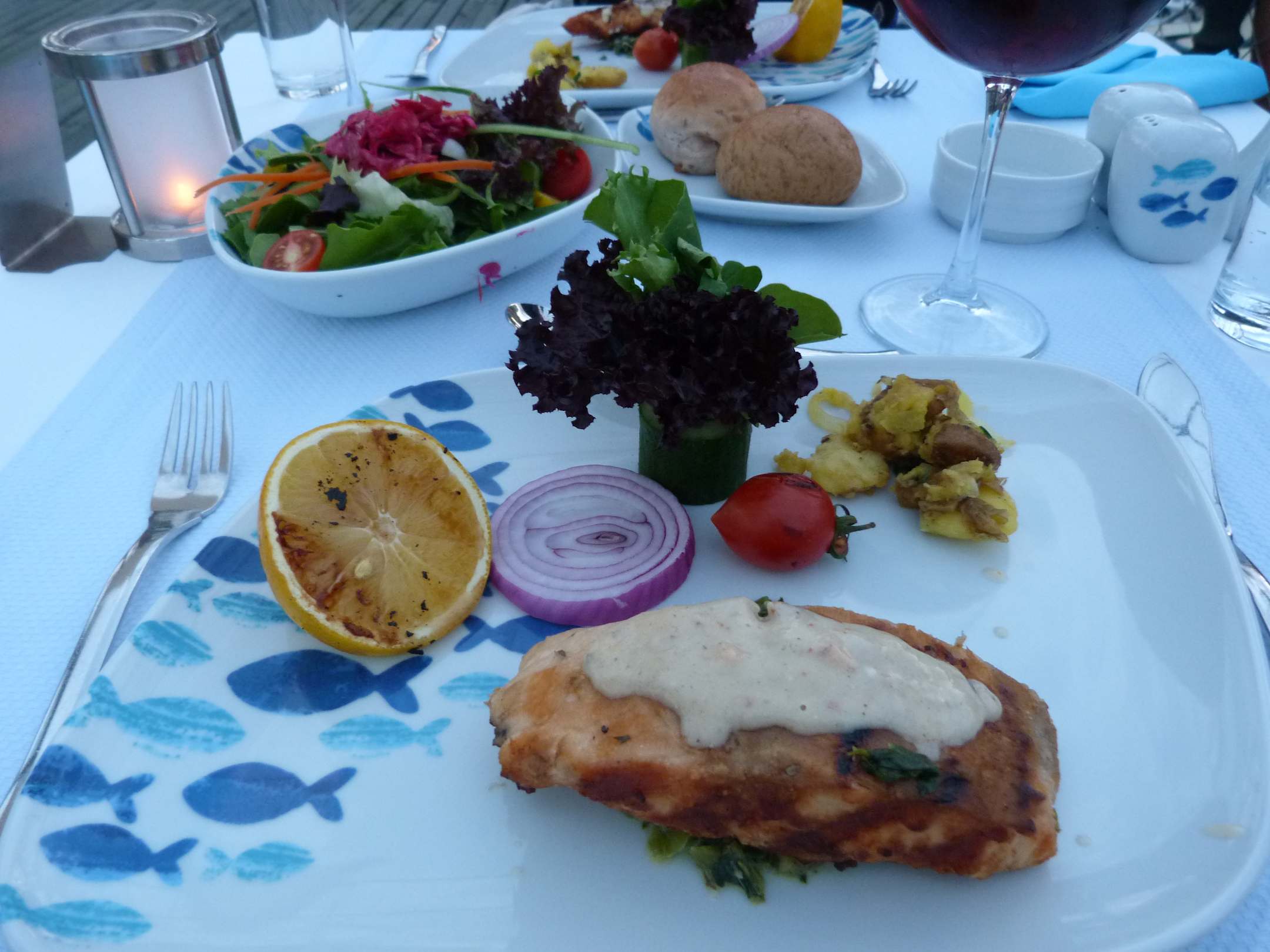 Leckeres Essen im A La Carte Fischrestaurant auf dem Schiff am Pool.