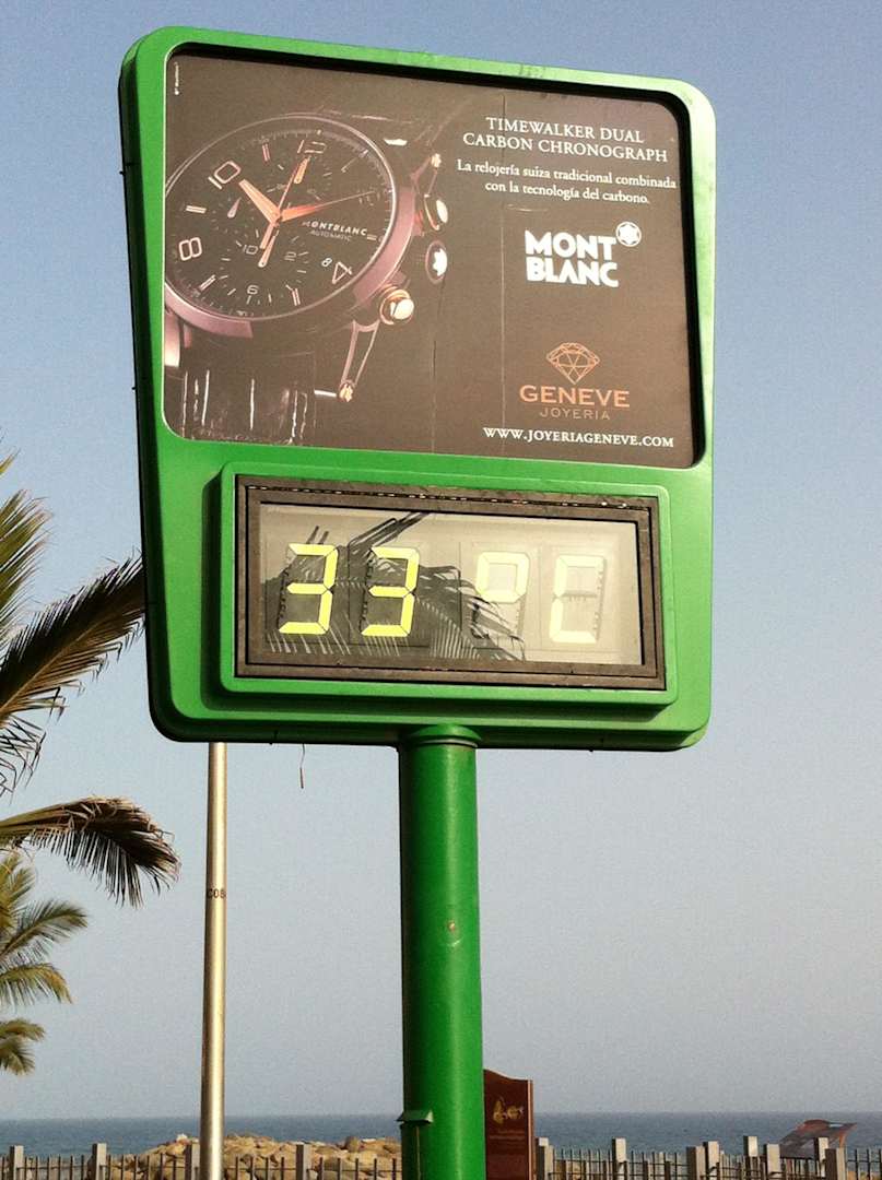Es sind 33 Grad um 19 Uhr. Diese Säulen stehen entlang an der Strandpromenade.