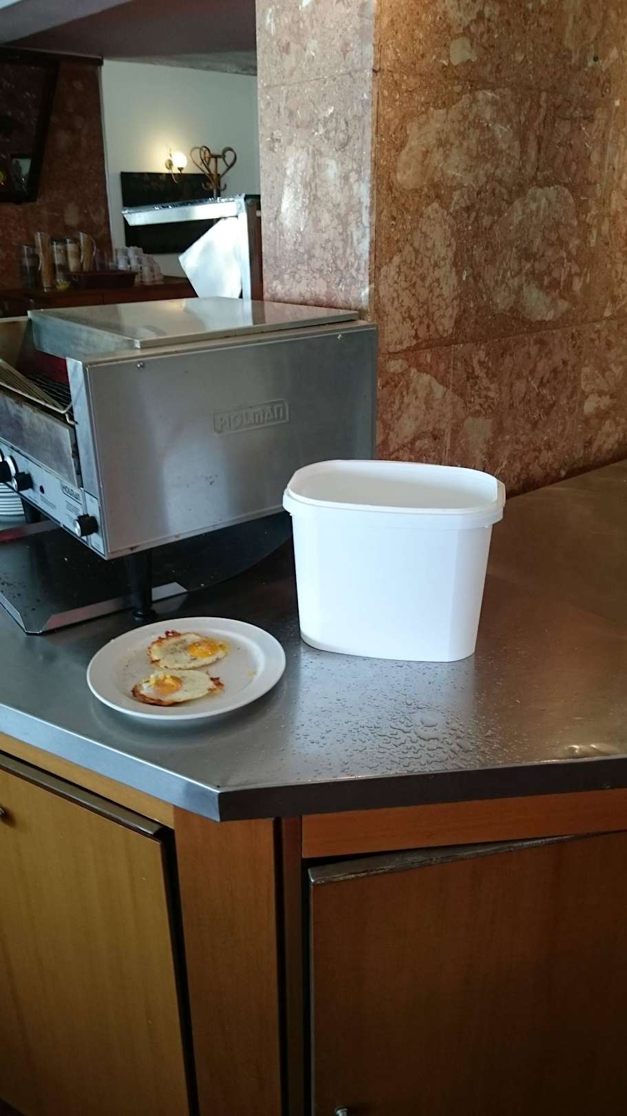 Wasser tropft durch die Decke in den Buffetberich