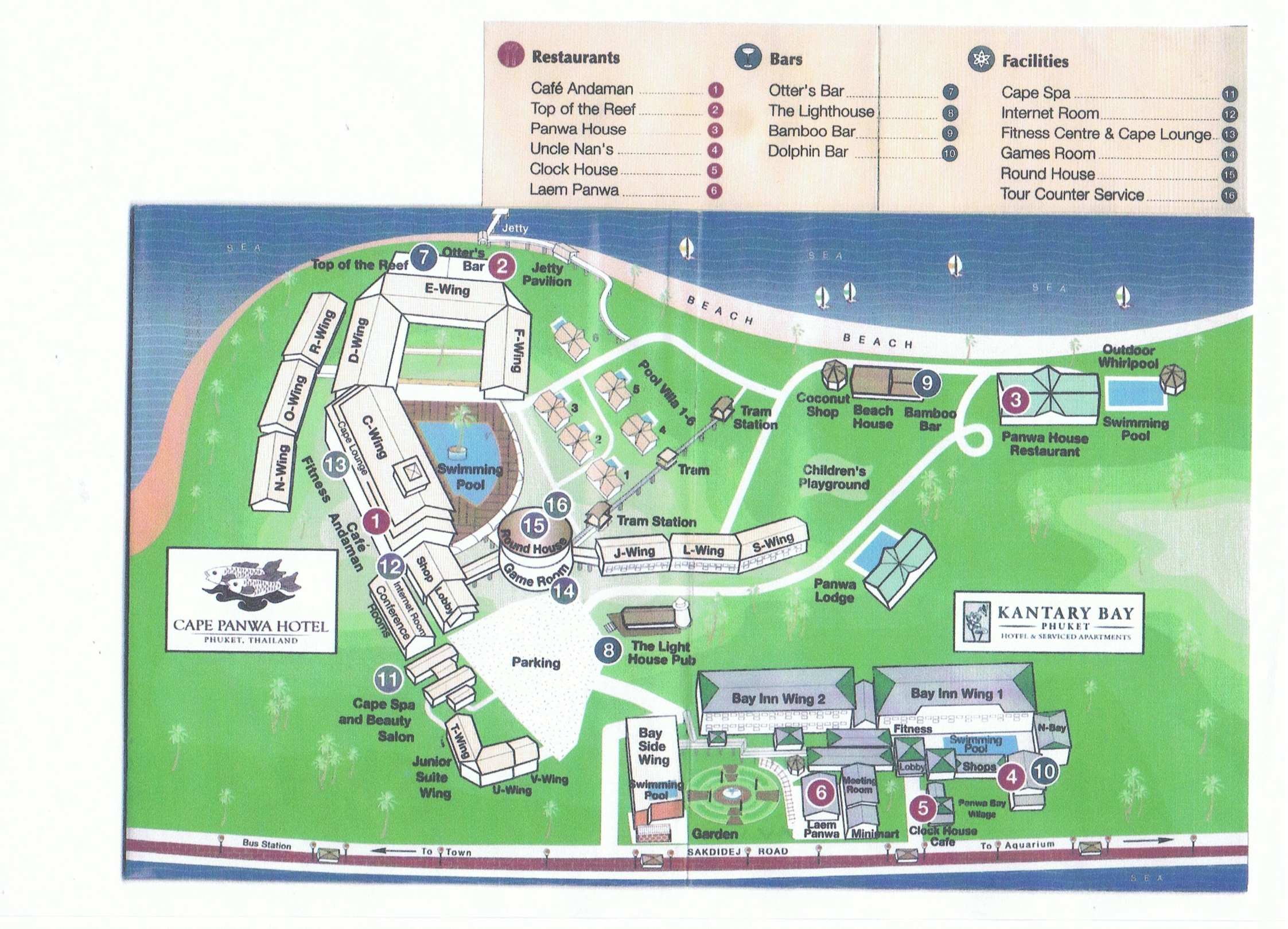 Karte vom Cape Panwa Karte der Anlage von Cape Panwa Hotel incl. aller Restaurants und das Schwesterhotel Kantay Bay.