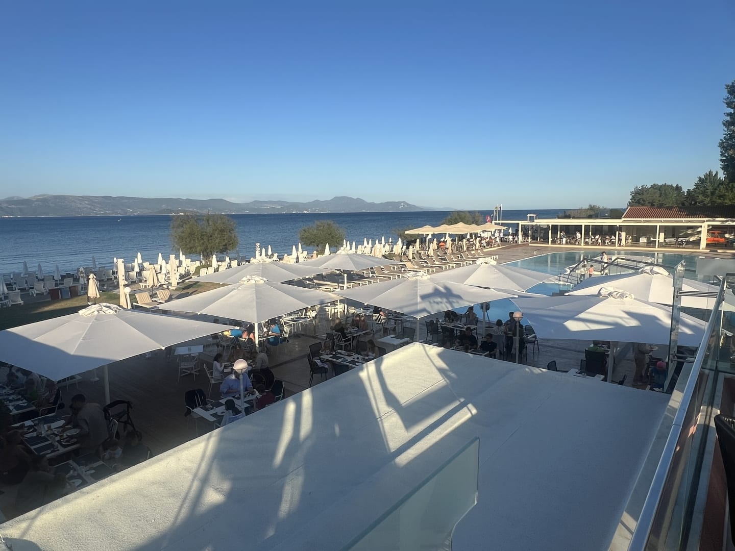 Blick von der Dachterrasse der Bar auf Pool, Poolbar und Strand.