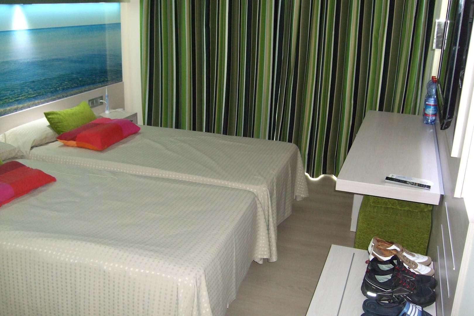 Doppelbett mit Fensterfront (Vorhänge)