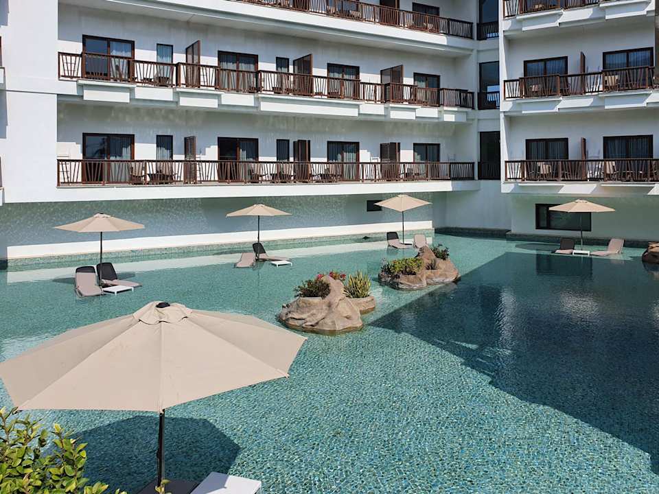 Hauptgebäude mit Zimmern und Wasserbecken mit Liegen und Sonnenschirmen