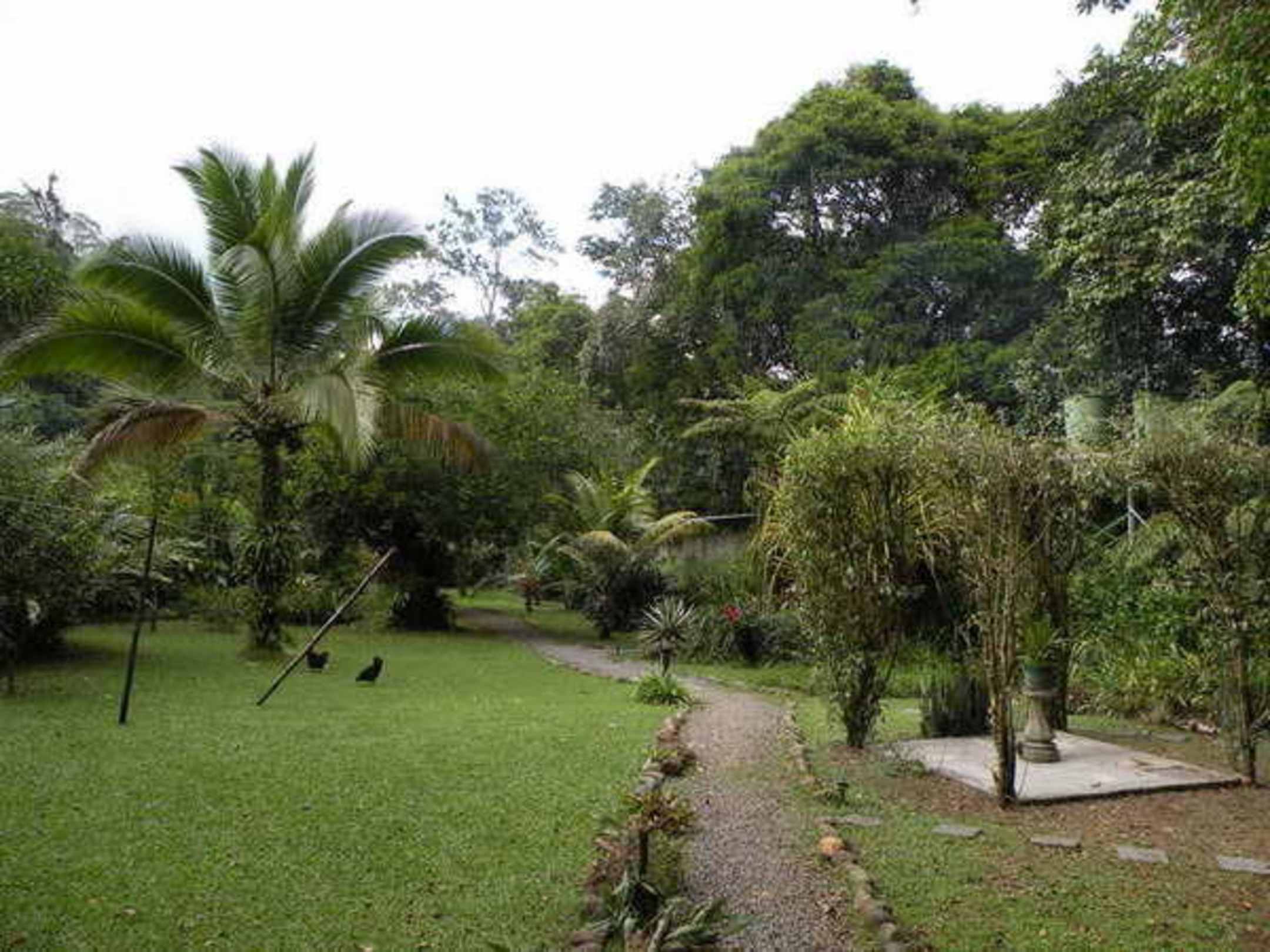 Ein Teil des der Gartenanlage, in der sich auch die Bungalows befinden. Die großen Baumkronen rechts gehören schon zu Bäumen des unmittelbar angrenzenden Urwaldes.