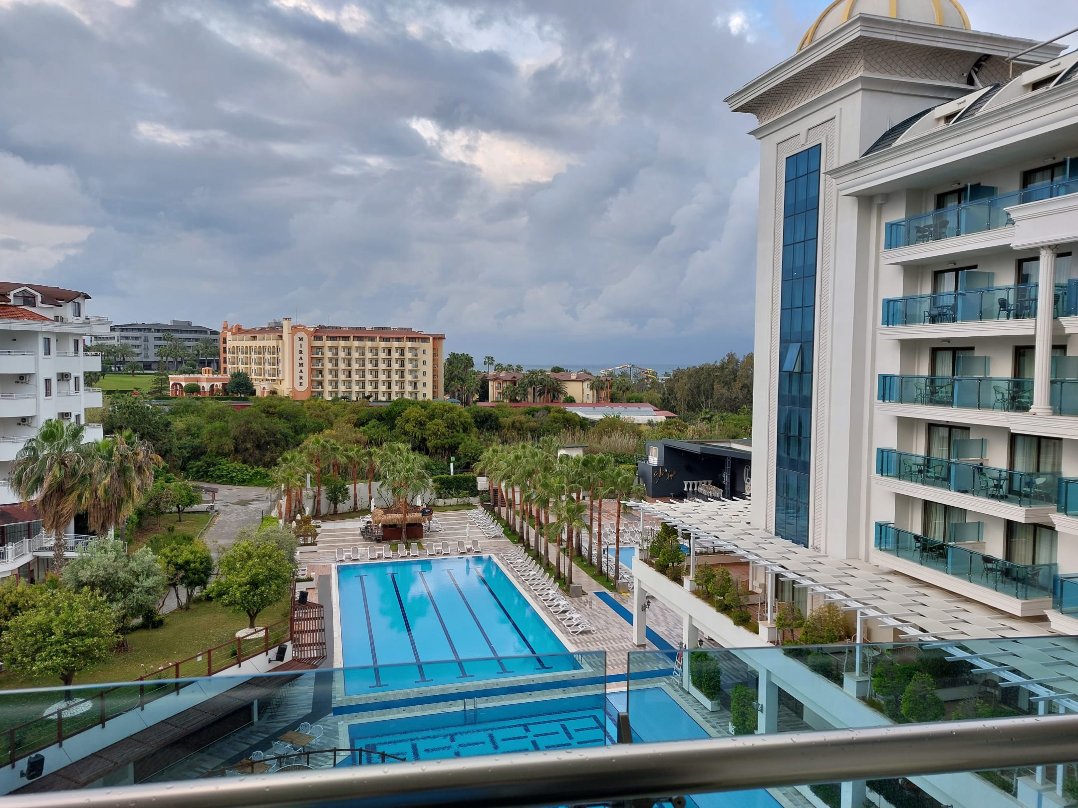 Blick vom Balkon eines Zimmers mit Meerblick (im Hintergrund sieht man das Mittelmeer)