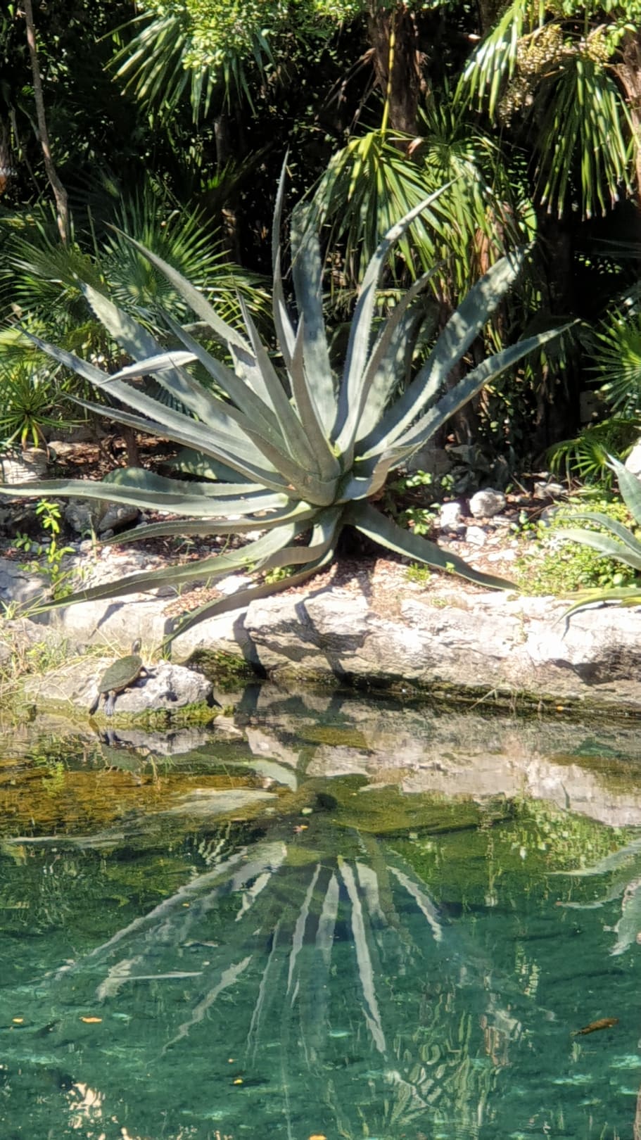 Cenote im Hotelbereich mit sonnenbadender Schildkröte