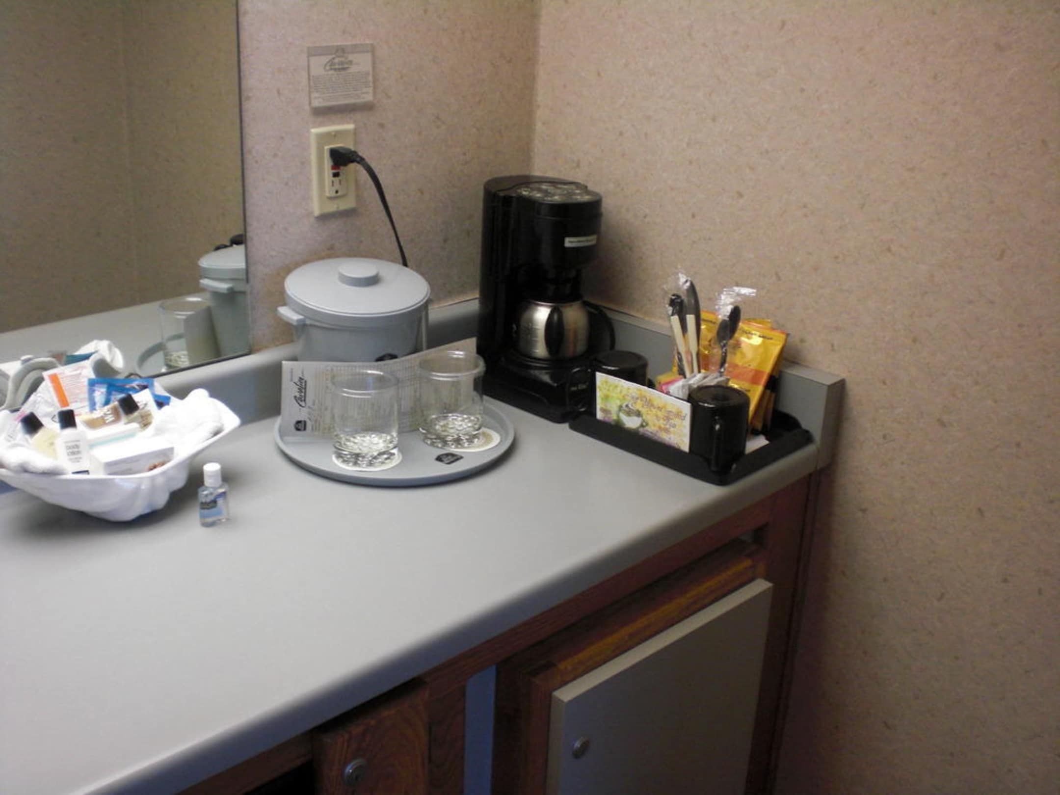 Kaffemaschine und Hygieneartikel im Zimmer