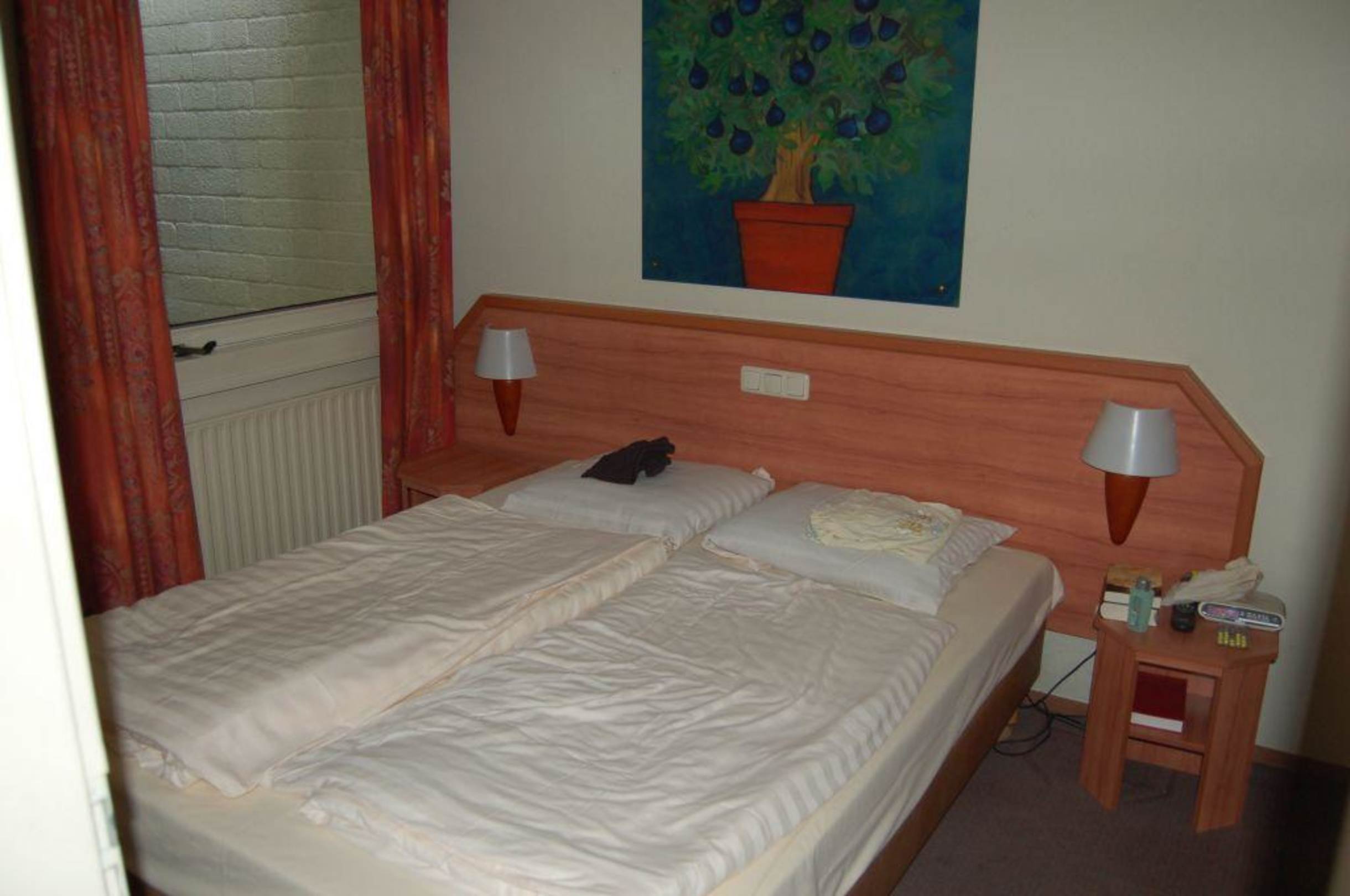 Schlafzimmer. Auf dem Bild nicht zu sehen ist der Kleiderschrank, großer Spiegel und Ablage mit Föhn und ein Fernseher, was sich alles rechts vom Bett befindet.