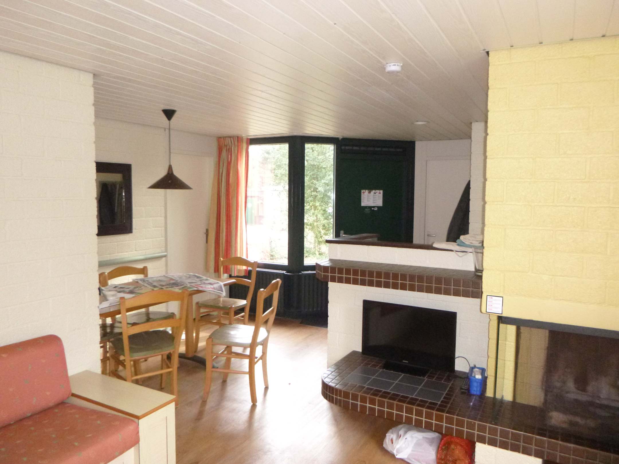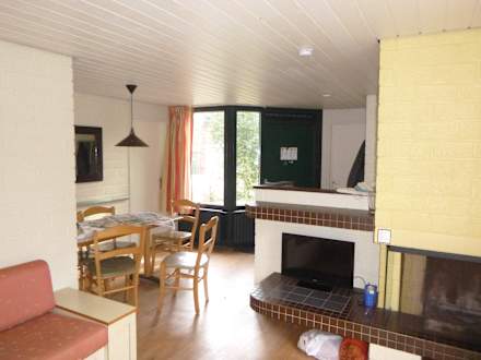 Wohnzimmer mit Fernseher und Kamin