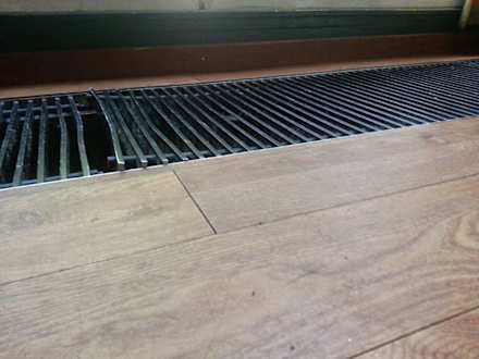 This is the grate at the patio entrance next to the tiny excuse of a fireplace. No idea how the metal could have been damaged like this and left for people to trip on. An of course the unsanitary floor is a standard feature.