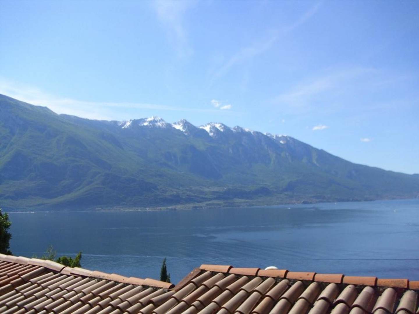 Blick vom Zimmer bzw. der davor liegenden Terrasse über die Dächer der darunter liegenden Hotelgebäude auf den See und die gegenüber liegenden Berge.