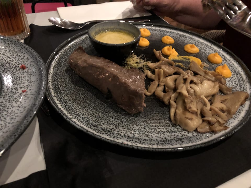 Rindsfilet mit Pilzen, Karottenpueree und Senfsauce