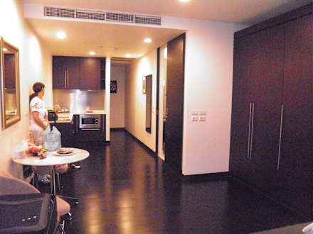 Links Küchenzeile, rechts Bad