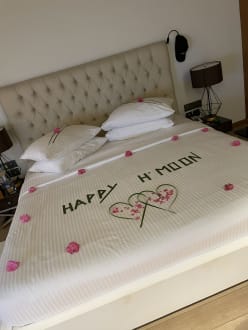 Überraschung unserer Flitterwochen auf dem Bett: Happy H-Moon