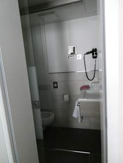 ZimmerZwischen Zimmer und Toilette ist mit zwei Glasschiebetüren die Dusche. Etwas unpraktisch, weil man nach dem Duschen über nassen Boden läuft.