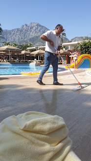 Den ganzen Tag gehen mind. 2 Mitarbeiter mit Wischmops über das gesamte Gelände. 1. wegen der Sauberkeit 2. Damit die Fliesen durch das Wasser nicht rutschig werden