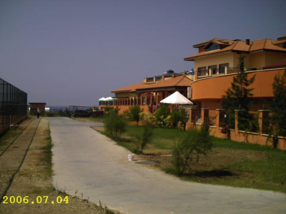 Links neben dem Hotel geht der Weg zum Strand entlang. Bei dem Sonnenschirm hält der Traktor.