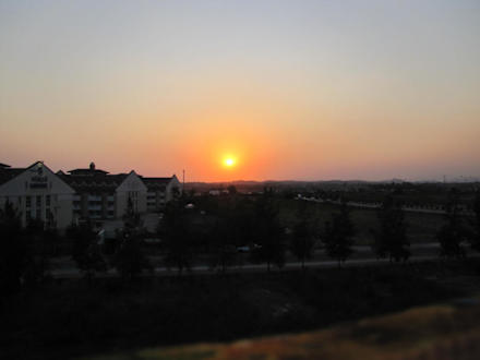 Ausblick aus dem Zimmer 433, jeden Abend ein schöner Sonnenuntergang. Gegenüber ist ein anderes Hotel, rechts die Hauptstraße, die man aber nicht störend wahrnimmt.