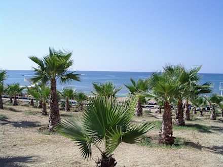 Blick an den kleinen Palmen vorbei auf den StrandBlick auf den Strand von der Strandbar des Club Grand Side aus fotografiert