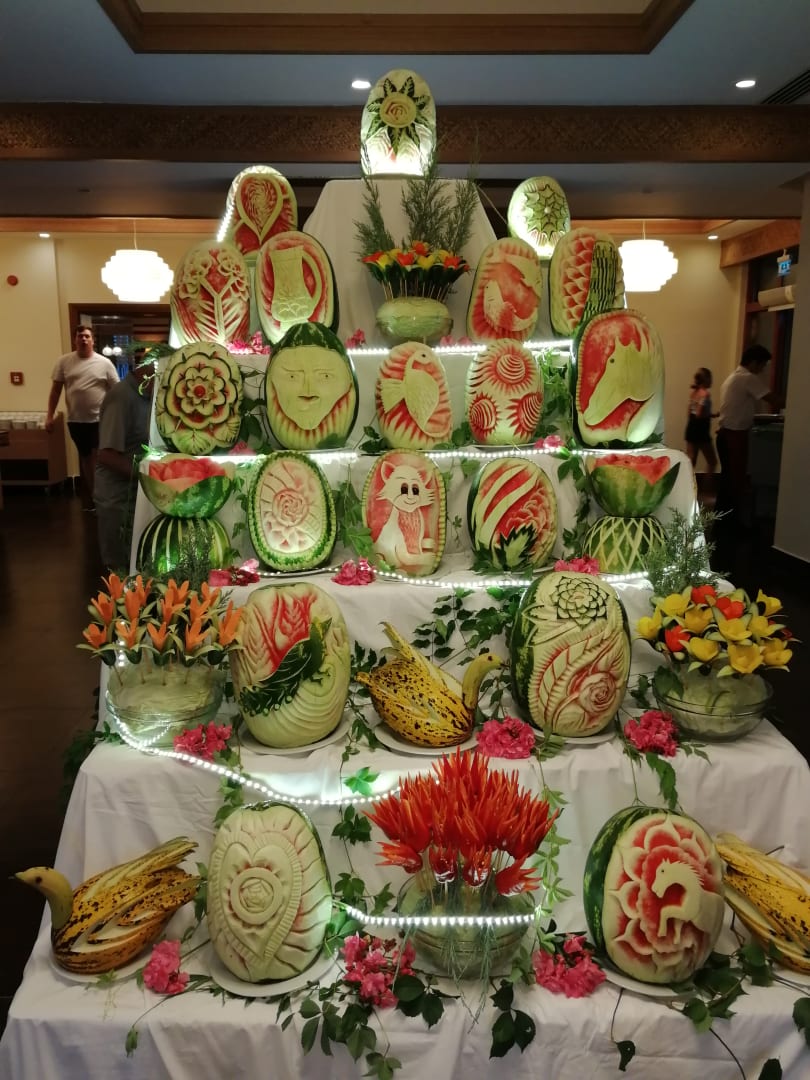 Kunstwerke aus Wassermelonen am Eingang zum Buffet.