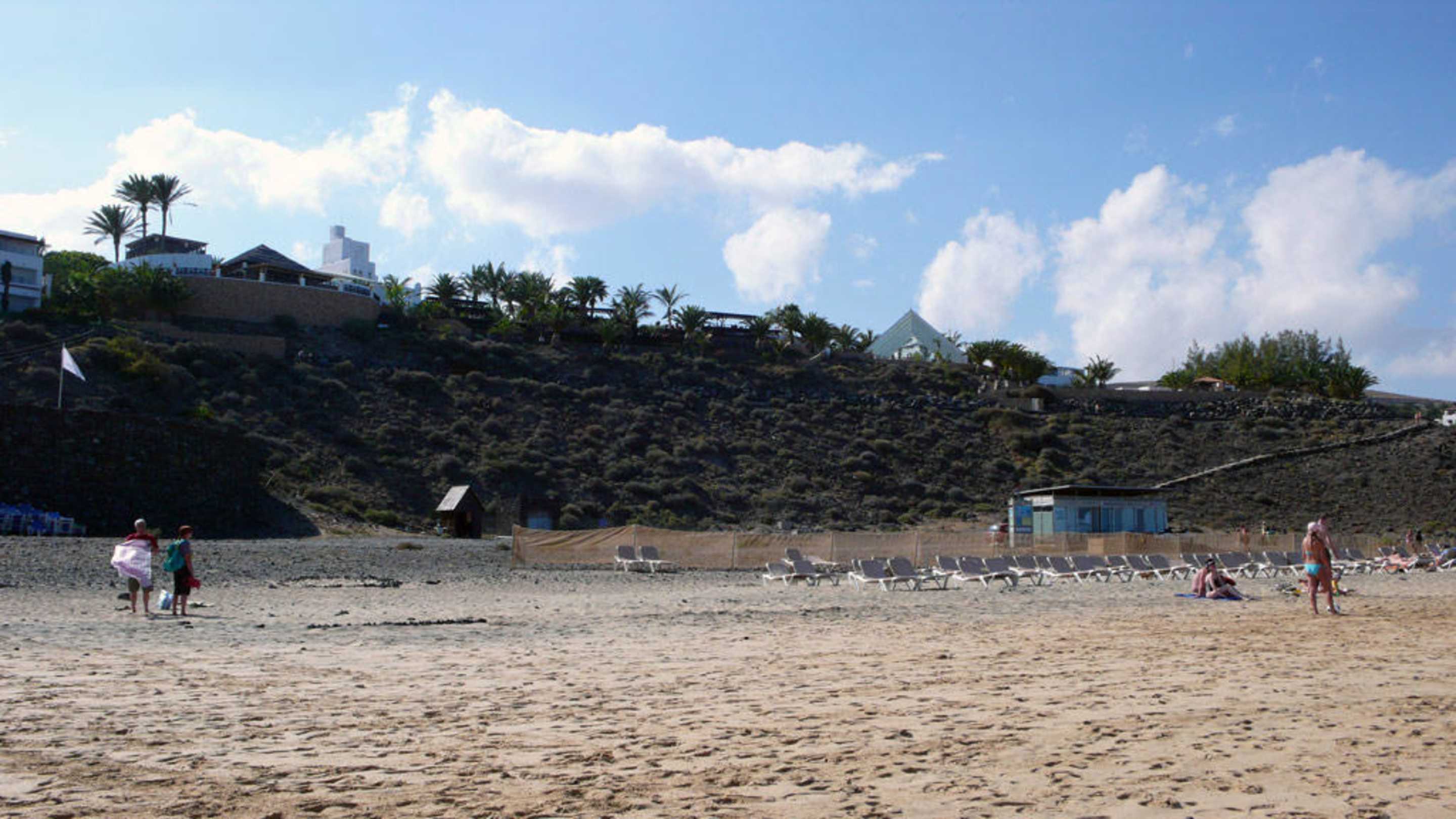 südöstlicher Blick vom Strand auf die Hotelanlage mit rechter Treppe zum Strand.